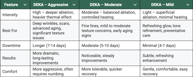 This table highlights how the three modes of DEKA Pulse compare in intensity, downtime, and results, so you can see which treatment aligns best with your goals.